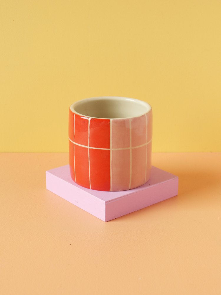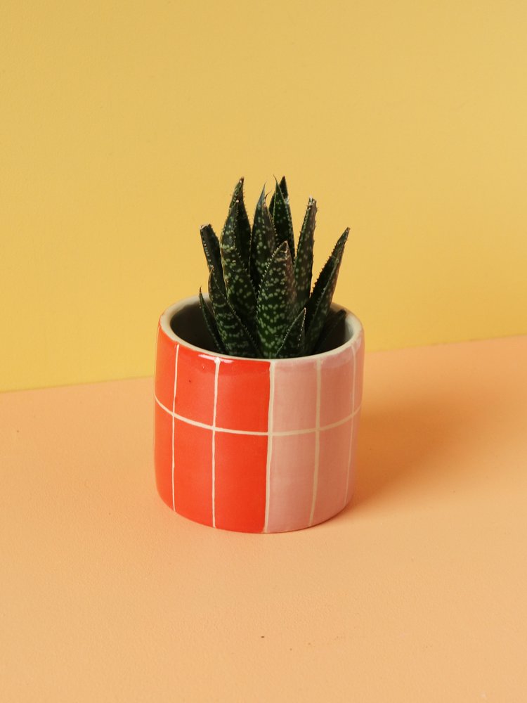 Stoneware planter with hand carved details in a bright red and pink combo! Perfect for a small cactus, succulent or seedling! There is a small hole in bottom of pot for water drainage. Approx 2.5” height x 3" diameter.